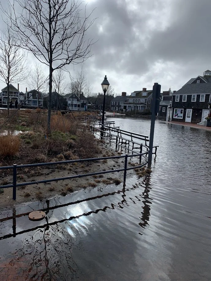Nuisance FloodingEasy Street is a critical route for goods and services (fuel, food, building materials, persons, equipment etc.) going to the Steamship Authority terminal and lower Broad Street. Easy Street Nuisance Flooding (flooding that leads to public inconveniences, such as road closures, overwhelmed storm drains, and deterioration of public infrastructure such as roads) of 25-35 times/year was first recorded in 2005 and more consistently seen starting in 2010 and has increased to 50+ times/year in 2021. (Photo by Will Kinsella)