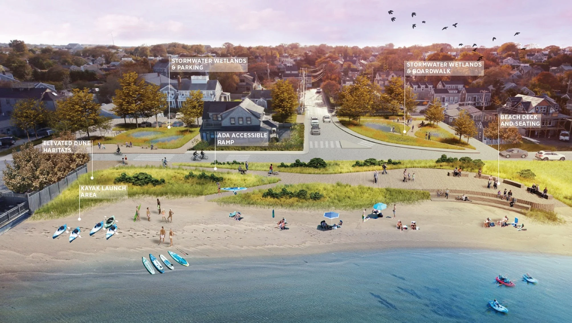 The Washington Street corridor was once a working waterfront for mariners, crafts/tradesman and fishermen, and is now one of Nantucket’s key transportation routes. An abundance of historical photos from the Nantucket Historical Association provide a visual narrative of the evolving shoreline. Today, this waterfront corridor is highly vulnerable to rising sea and ground water levels, as well as increased stormwater flooding. The Land Bank has partnered with SCAPE, Woods Hole Group, ReMain Nantucket, and the Town of Nantucket to conceptualize improvements to this area that will enhance flood storage capacity, public recreation, and healthy coastal habitats, while improving multi-modal access (e.g., biking, walking, driving) to and from downtown.